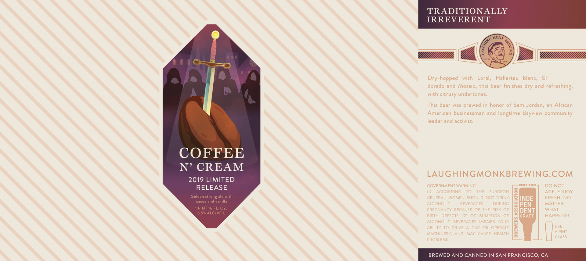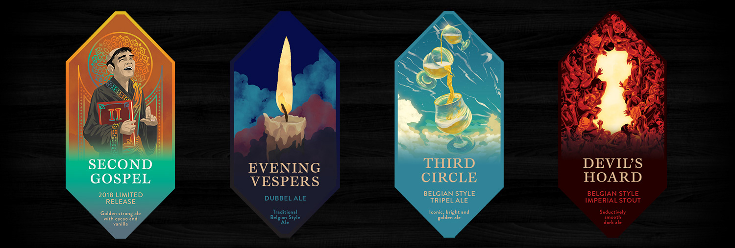 I started working with Laughing Monk, a brewing company based out of the Bay Area, in 2017 before they became the brewing powerhouse they are today. Never short on whimsy nor on their shameless, quirky disposition, they continue to push the spectrum of catchy design and tasty beer. When I started, they only had a logo and were very open to creative direction. Alongside another designer, we developed labels for their first bottle release. Since then, I've worked on many more labels; marketing collateral such as digital media assets, promotional flyers, and pins; and merchandise such as shirts.